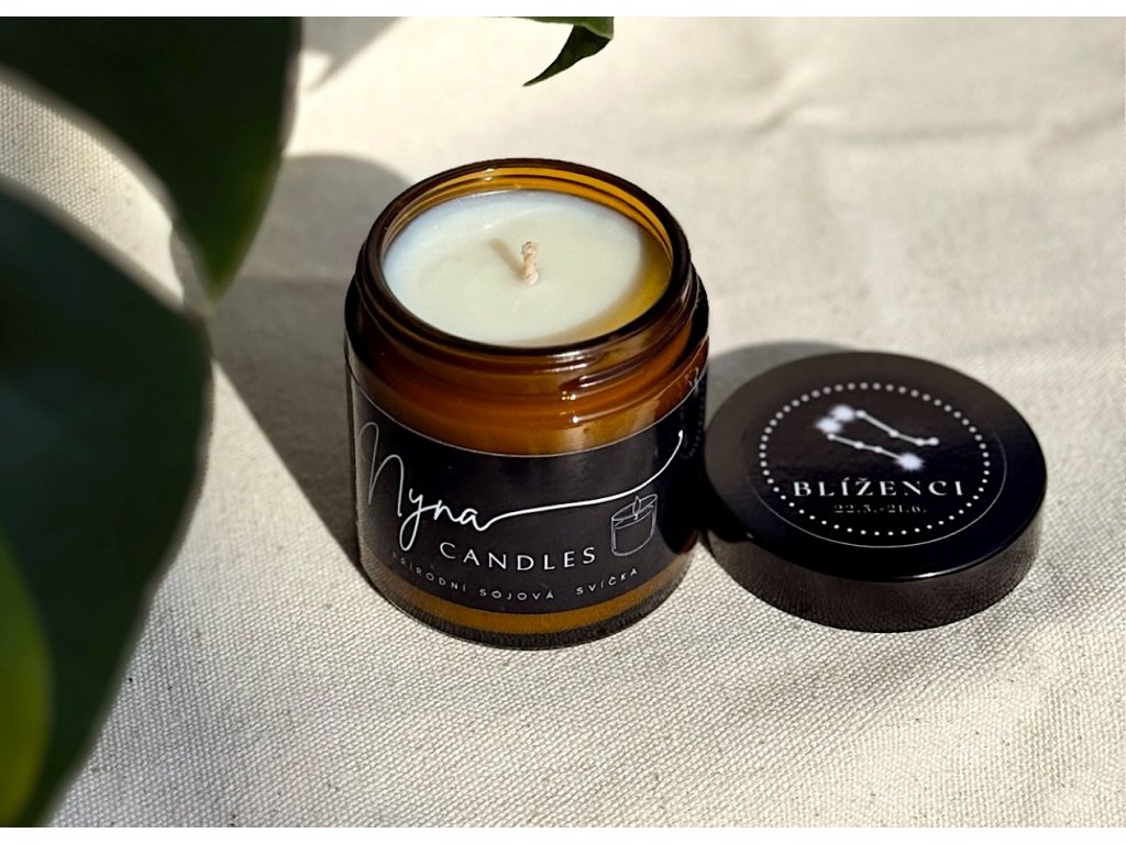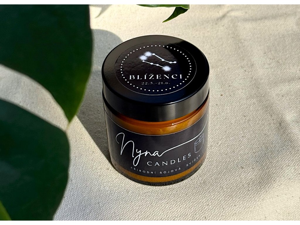 Blíženci - astrologická svíčka s esenciální směsí mandarinky, neroli a pačuli pro klid, inspiraci a rovnováhu dynamické povahy.