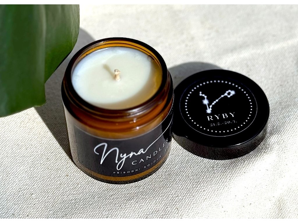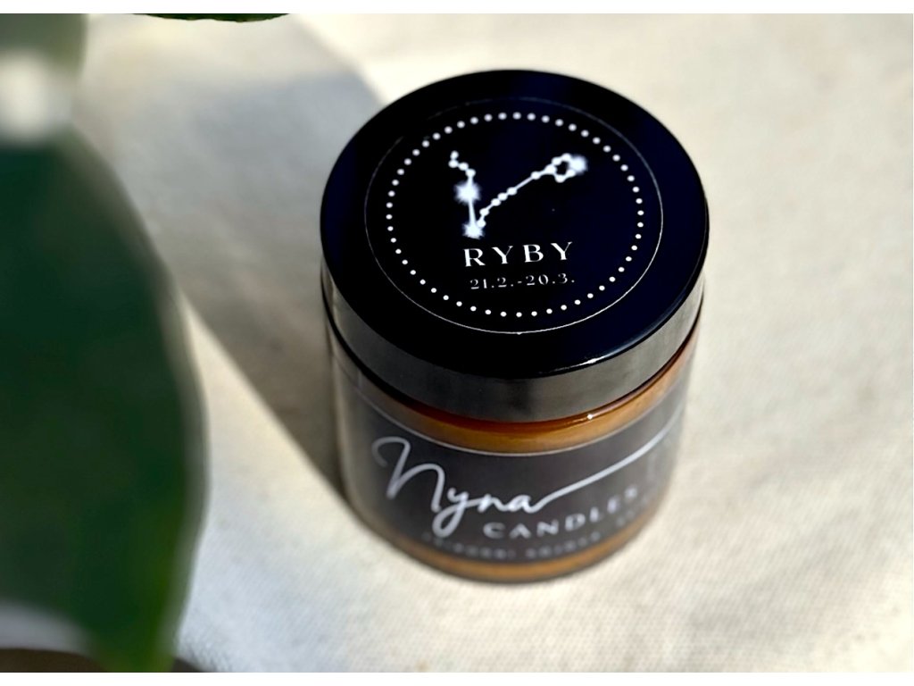 Ryby - astrologická svíčka s esenciální směsí jalovce, meduňky a pačuli pro klid, intuici a vnitřní harmonii.